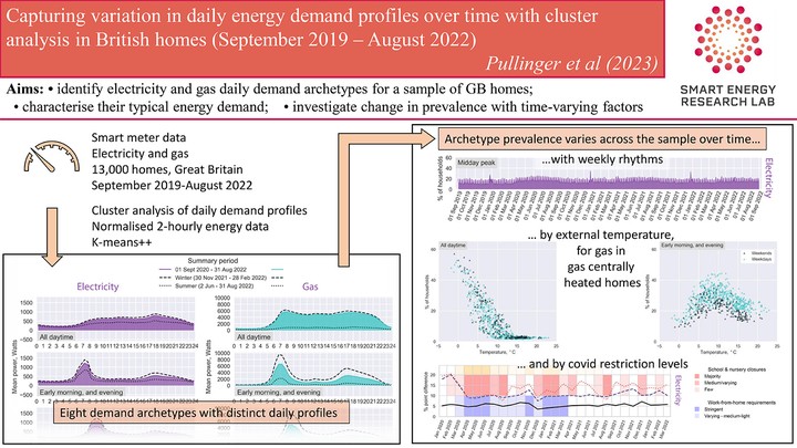 This study investigates typical domestic energy demand profiles and their variation over time. It draws on a sample of 13,000 homes from Great Britain, applying k-means cluster analysis to smart meter data on their electricity and gas demand over a three-year period from September 2019 to August 2022. Eight typical demand archetypes are identified from the data, varying in terms of the shape of their demand profile over the course of the day. These include an ‘All daytime’ archetype, where demand rises in the morning and remains high until the evening. Several other archetypes vary in terms of the presence and timing of morning and/or evening peaks. In the case of electricity demand, a ‘Midday trough’ archetype is notable for its negative midday demand and high overnight demand, likely a combination of the effects of rooftop solar panels exporting to the grid during the day and overnight charging of electric vehicles or electric storage heating. The prevalence of each archetype across the sample varies substantially in relation to different temporally-varying factors. Fluctuations in their prevalence on weekends can be identified, as can Christmas Day. Among homes with gas central heating, the prevalence of gas archetypes strongly relates to external temperature, with around half of homes fitting the ‘All daytime’ archetype at temperatures below 0 °C, and few fitting it above 14 °C. COVID-19 pandemic restrictions on work and schooling are associated with households’ patterns of daily demand becoming more similar on weekdays and weekends, particularly for households with children and/or workers. The latter group had still not returned to pre-pandemic patterns by March 2022. The results indicate that patterns of daily energy demand vary with factors ranging from societal weekly rhythms and festivals to seasonal temperature changes and system shocks like pandemics, with implications for demand forecasting and policymaking.